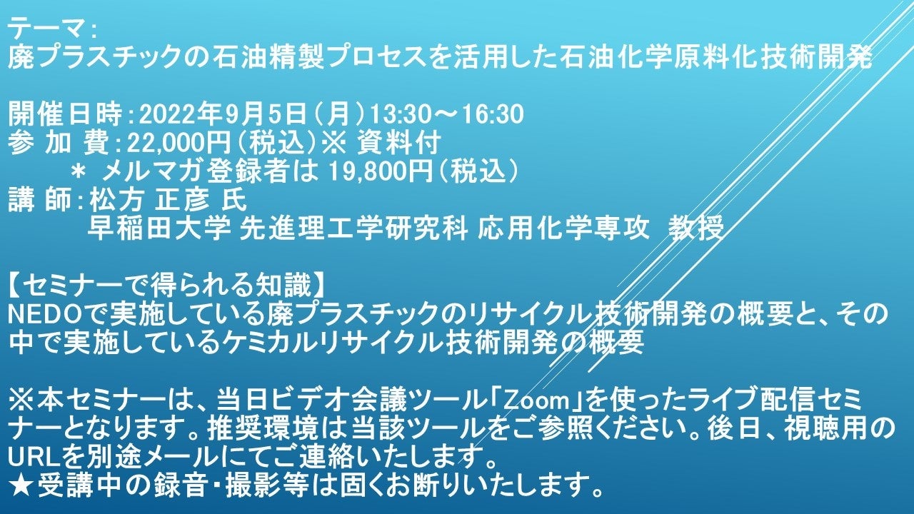 先端技術情報や市場情報を提供している(株)シーエムシー・リサーチ(千代田区神田錦町: https://cmcre.com/ )では、 各種材料・化学品などの市場動向・技術動向のセミナーや書籍発行を行っておりますが、 このたび「廃プラスチックの石油精製プロセスを活用した石油化学原料化技術開発」と題するセミナーを、 講師に松方 正彦 氏 早稲田大学 先進理工学研究科 応用化学専攻 教授)をお迎えし、2022年9月5日(月)13:30より、 ZOOMを利用したライブ配信で開催いたします。 受講料は、 一般:22,000円(税込)、 弊社メルマガ会員:19,800円(税込)となっております(資料付)。
