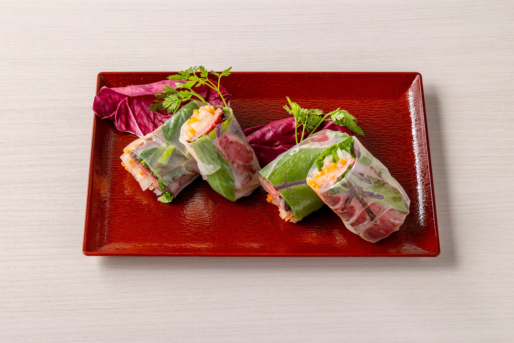 ローストビーフの生春巻き バルサミコソース、ポルぺッティ、スズキとシチリアレモンのエスカベッシュ