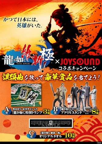 株式会社エクシングが展開する通信カラオケ「JOYSOUND」では、大人気アクションアドベンチャーゲームの最新作『龍が如く 維新! 極』が、本日2月22日に発売されることを記念して、『龍が如く』シリーズお馴染みの楽曲であり、本作にも登場する「ばかみたい」の幕末アレンジバージョンと、「い・ち・ず・侍」の2曲をゲーム映像を背景に歌えるカラオケとして配信中!さらに、『龍が如く』シリーズ アクリルスタンドコンプリートセットなどが当たる「龍が如く 維新! 極×JOYSOUND コラボキャンペーン」を本日からスタートします。