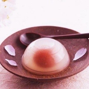 透明な葛の中に刻んだ桜の葉を練り込んだ桜色の餡。