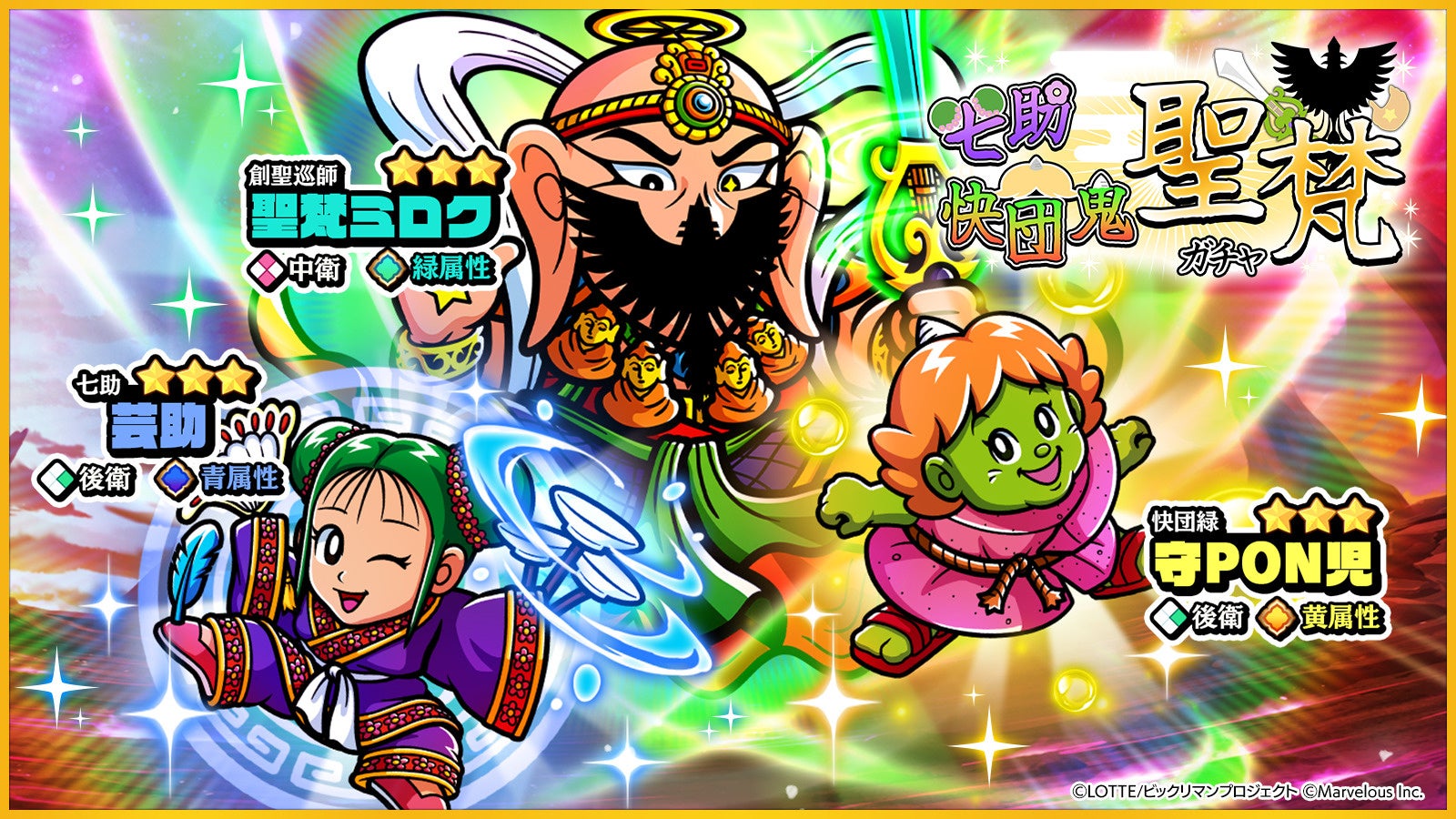 新たな☆3キャラクター「[創聖巡師]聖梵ミロク」「[七助]芸助」「[快団緑]守PON児」が登場する、「七助 快団鬼 聖梵ガチャ」を開始いたしました。
