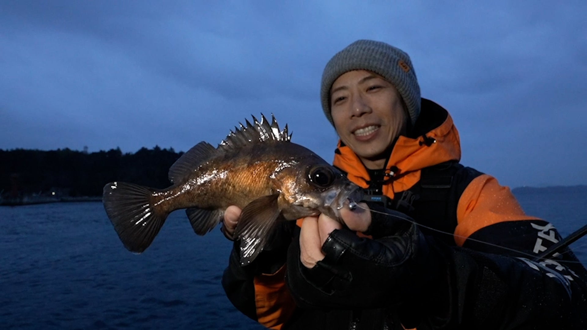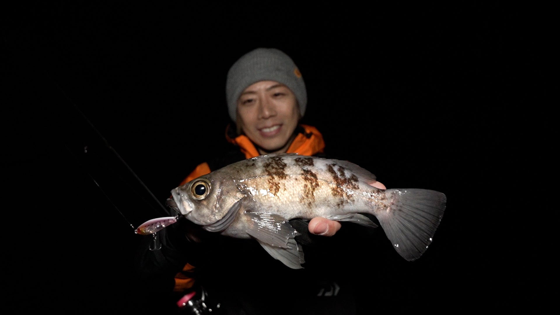 日が沈みはじめ、ボトム付近を丁寧に探るとヒット!現れたのはムラソイ。夕マヅメのチャンスタイム、さらにワームをキャストするとロッドが大きく曲がる強烈なアタリ。
