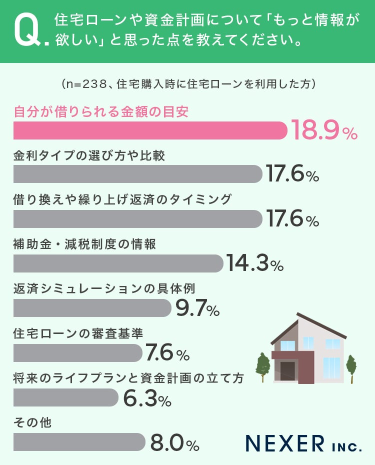 18.9%が「自分が借りられる金額の目安」、17.6%が「金利タイプの選び方や比較」と「借り換えや繰り上げ返済のタイミング」、14.3%が「補助金・減税制度の情報」と回答しました。
