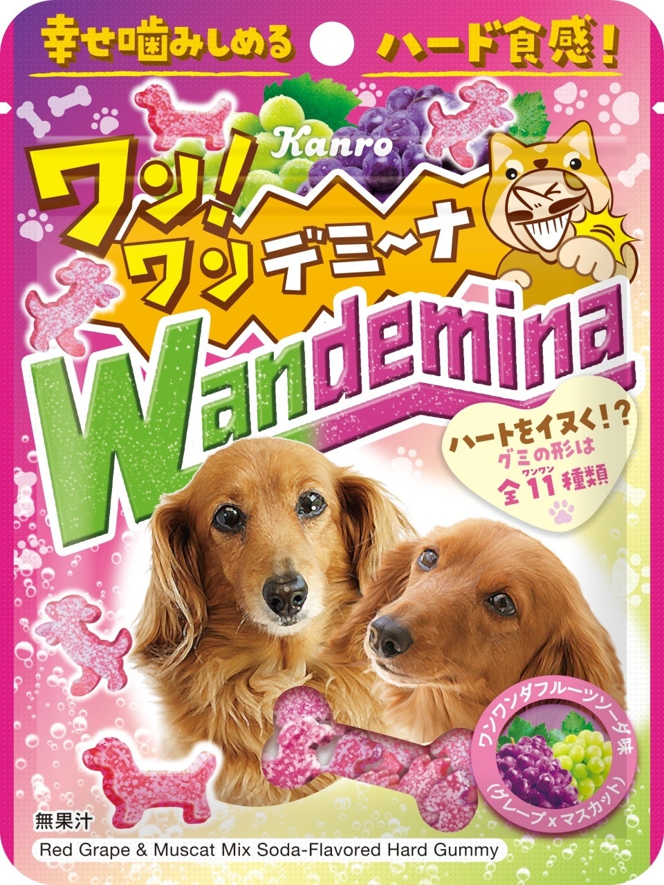 【内容】人気グミ「カンデミーナ」が、かわいい犬の形になりました!幸せを噛みしめるハード食感グミです。グレープ×マスカットの、ワンワンダフルーツソーダ味です。グミの形は全11(ワンワン)種類。パッケージ(全5種)