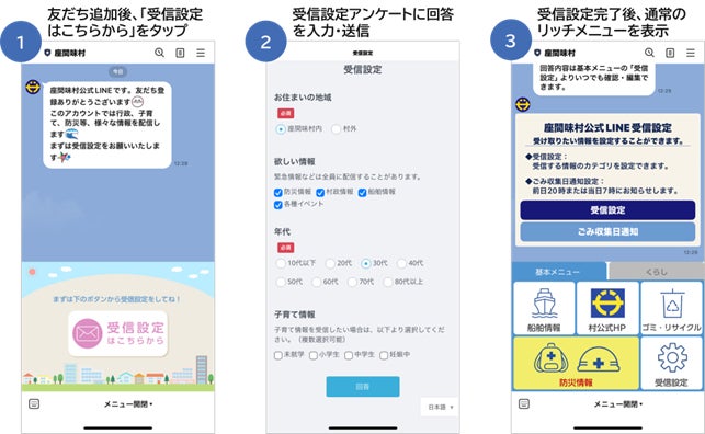 座間味村LINE公式アカウントを友だち追加すると、受信設定アンケートへのリンクが設定されたリッチメニューが表示されます。利用者は受信設定の回答を済ませないと、通常のリッチメニュー表示やメッセージ配信がされません。友だち追加と同時に受信設定アンケートへ誘導することで、必要な情報のみを効果的に配信することができます。