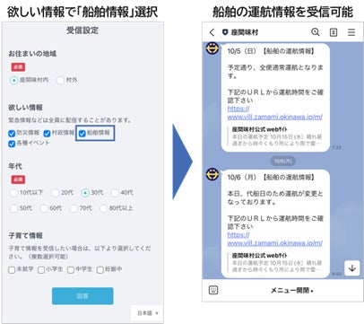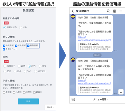 利用者が受信設定アンケートで登録した内容に合わせて、村政情報、子育て情報、ごみ収集日などの情報をセグメント配信しています。各種情報カテゴリの中でも特に、村民・村外居住者ともに関心が高い船舶の運航情報の発信に力を入れています。受信設定で「船舶情報」を選択した利用者に対して、毎朝、座間味村・沖縄本島間を結ぶフェリー・高速船の運航予定をメッセージ配信しています。