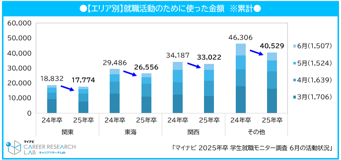 6月までにかかった就活費用の累計額は27,971円、前年同月比で2,963円少なくなり、2年連続で減少した。地域別でみると「関東」が17,774円で最も少なく、いずれの地域でも金額は減少している。応募した企業から交通費や宿泊費を支給されたことのある割合は67.9%と前年から8.5pt増加、平均合計支給額の平均も43,031円と、前年から3,572円増加し、1人当たりの学生の就活費負担は軽減していることがわかった。選考時期や面接形式など就職活動を取り巻く環境の変化が影響していると考えられる。【図3、4、5】