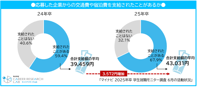 企業から交通費や宿泊費を支給されたことのある学生が増加し、合計支給額の平均は4万円を超えました。企業の新卒採用における初任給引き上げが注目されていますが、就職活動を行う学生に対してもこのようなサポートを行う企業側の配慮が感じられます。また売り手市場の中で、選考参加者数を増やしたいといった背景もあるでしょう。