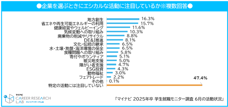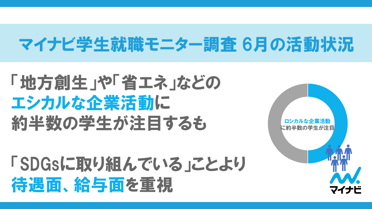 「地方創生」や「省エネ」などのエシカルな企業活動に約半数の学生が注目するも、「SDGsに取り組んでいる」ことより待遇面、給与面を重視