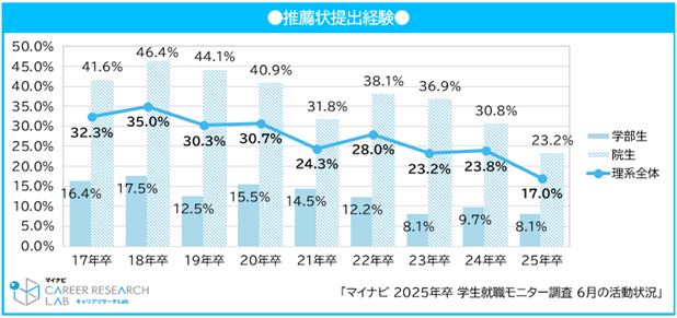 理系学生の推薦状提出経験は減少傾向。入社先が決まっている理系学生は89.6%が自由応募【図6、7、8】