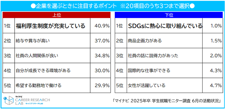 企業を選ぶときに注目することについて、20項目のうち3つを聞くと、「福利厚生制度が充実している(40.9%、前年比2.8pt増)」が最も多かった。一方、最も低かったのは「SDGsに熱心に取り組んでいる(1.0%、前年比0.2pt増)」で、企業のSDGsに対する取り組みは、就職先選びにおいては福利厚生や給与など、自身の生活に直結する項目に比べ優先されにくい傾向がみられた。