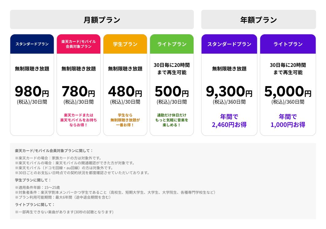 楽天グループ株式会社が運営する定額制の音楽聴き放題サービスです。iOSおよびAndroid(TM)アプリで展開しており、約1億曲の楽曲を提供しています(2023年7月時点)。料金プランは6種類あり、ユーザーは利用状況に応じて様々な選択肢から自分に合ったプランを選ぶことが可能です。