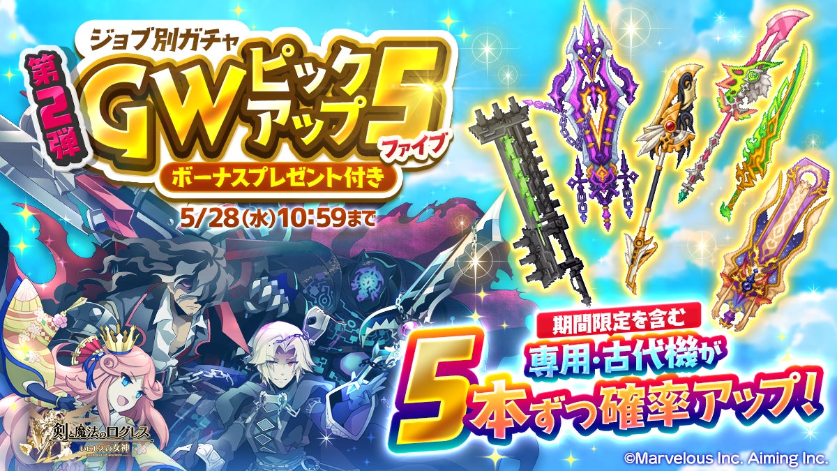 スマホ向け本格オンラインRPG『剣と魔法のログレス いにしえの女神』<期間限定を含む武器を5本ずつ確率アップ!「ジョブ別ガチャ GWピックアップ5 第2弾」販売!>
