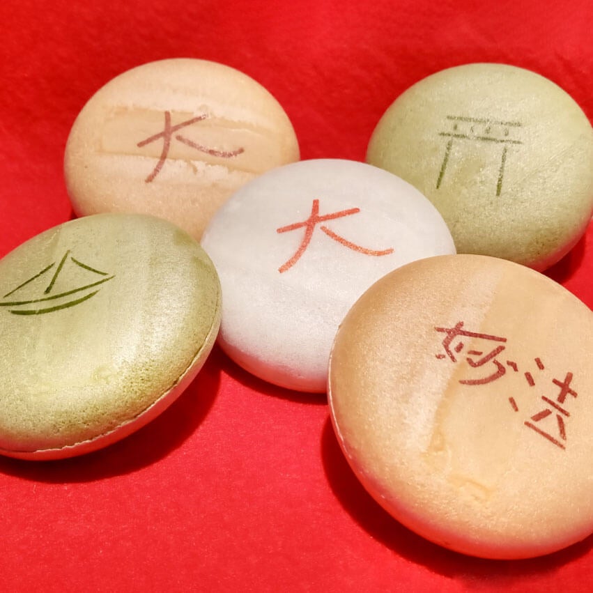 古都の夜空に浮かび上がる五山送り火をイメージしました。もっちりとした生地に粒あんと抹茶あんの2種類をご用意いたしました。