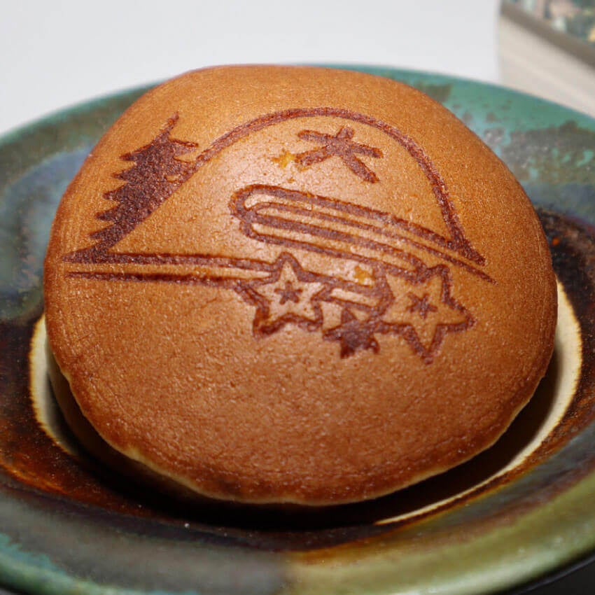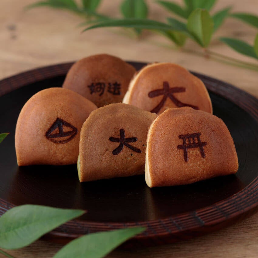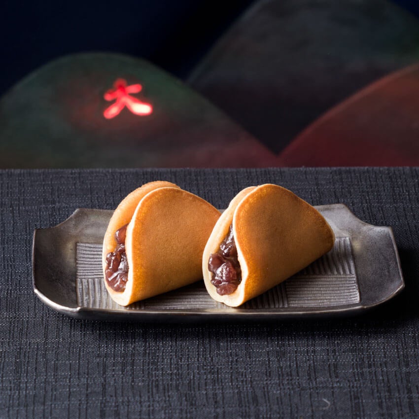甘露煮の栗と大納言小豆のつぶあんを、1枚1枚手焼きで作ったどら焼き生地で包みました。五山送り火の大文字をあしらった期間限定のどら焼きです。