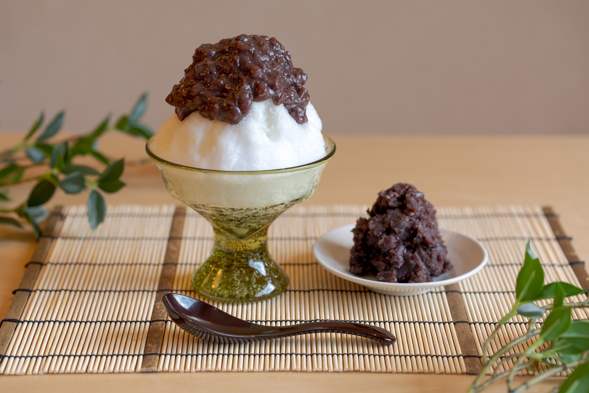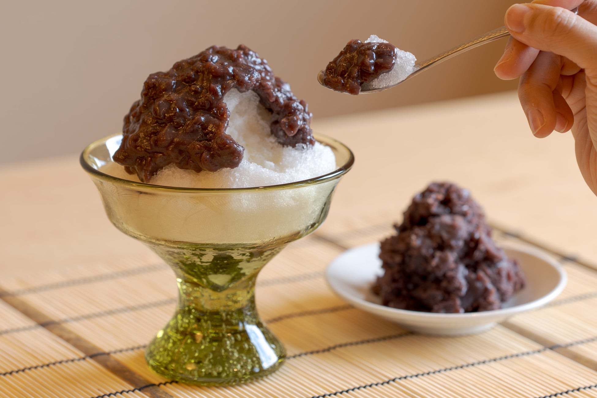 秋保を象徴する「さいち」のおはぎの特徴は、控えめな甘さと絶妙な塩気のあんこ。その美味しさを最大限に活かすため、削った氷に練乳をかけ、あんこを贅沢に上からたっぷりかけたかき氷としました。また、さいちのおはぎで人気な青大豆のきな粉と黒ゴマも添えて提供。お好みでトッピングでき、自分好みで味のアクセントをつけられます。器には、広瀬川の砂から生まれる「仙台ガラス」を使用。杜の都の緑を映したような器の中で、この地域の伝統の味をモダンな涼味として楽しめます。