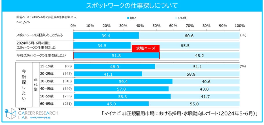 24年5-6月に非正規の仕事を探した人のうち34.5%が「スポットワークの仕事を探した」と回答。また、今後スポットワークを探したいと答えた人は51.8%に上った。多くの年代で就業意向が5割程度となっており、幅広い世代でスポットワークが浸透しはじめていることがわかる。