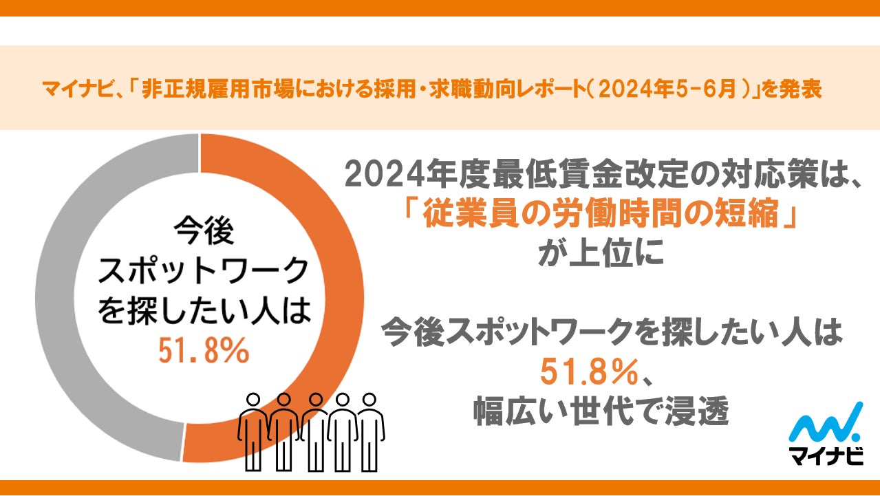 非正規雇用における企業の求人ニーズは求職ニーズを8.2pt上回る結果。2024年度最低賃金改定で引き上げが行われた際「従業員の労働時間の短縮」を検討する声も。今後スポットワークを探したい人は51.8%