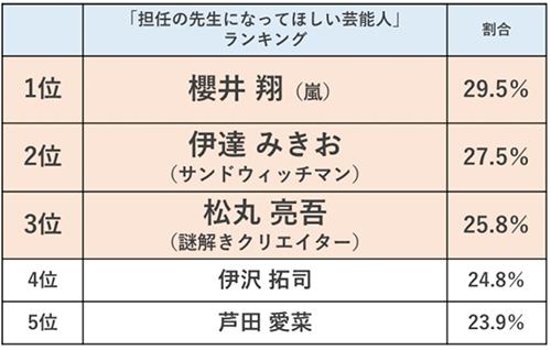 <担任の先生になってほしい芸能人ランキング TOP5>