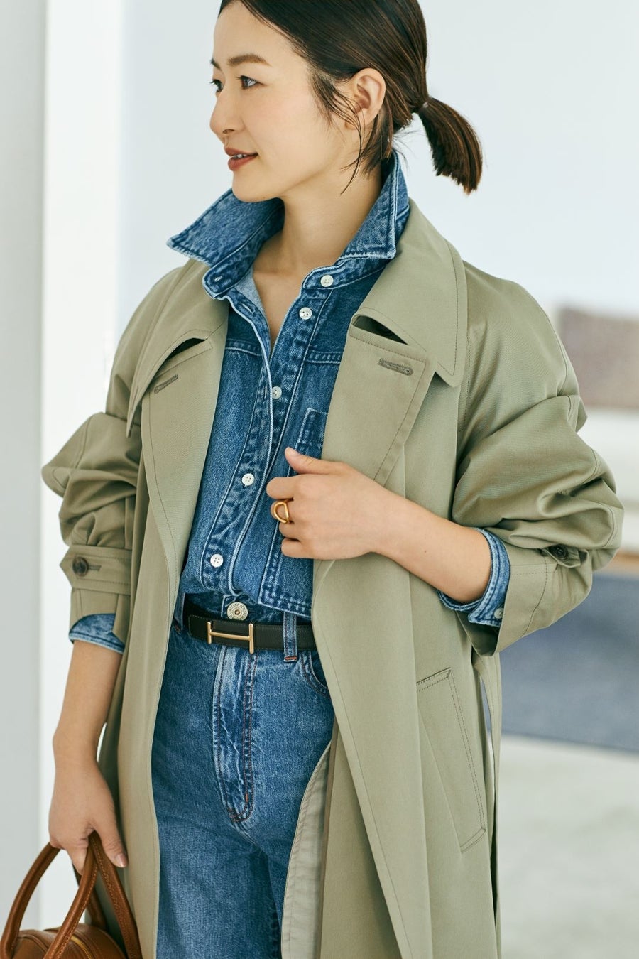 カーキの色味がカジュアルな装いとの相性抜群なので、今春気になるデニムのセットアップを合わせてキレイめカジュアルなコーディネートにしてみました。重みの出るスエード小物や、かっちりとした印象の黒ベルトを取り入れることで、カジュアルアップさせています。