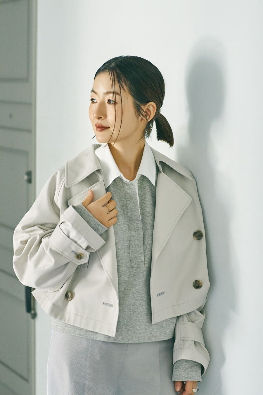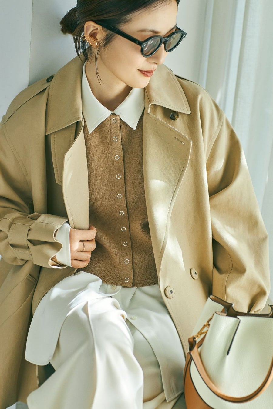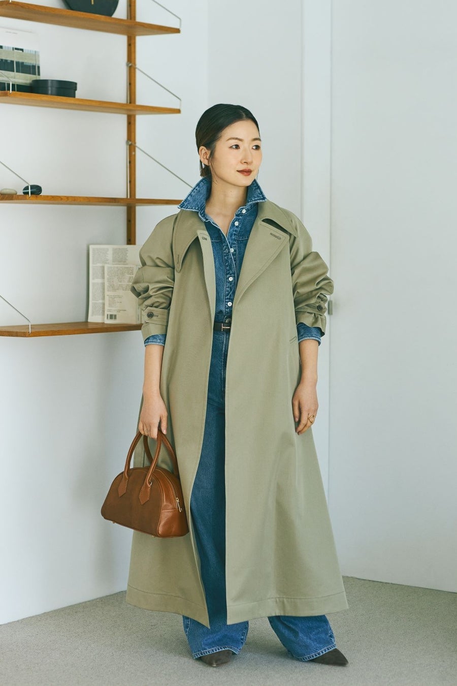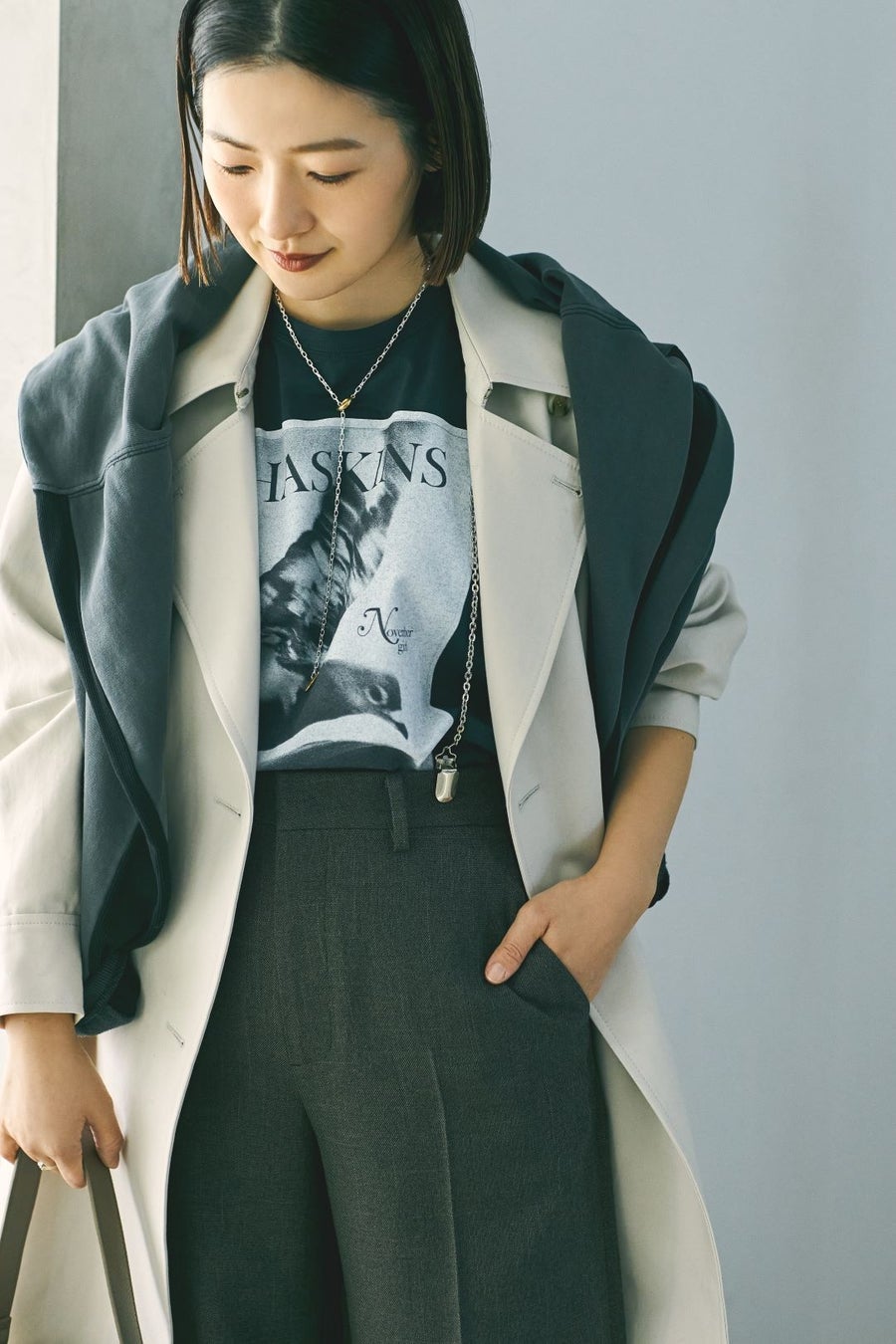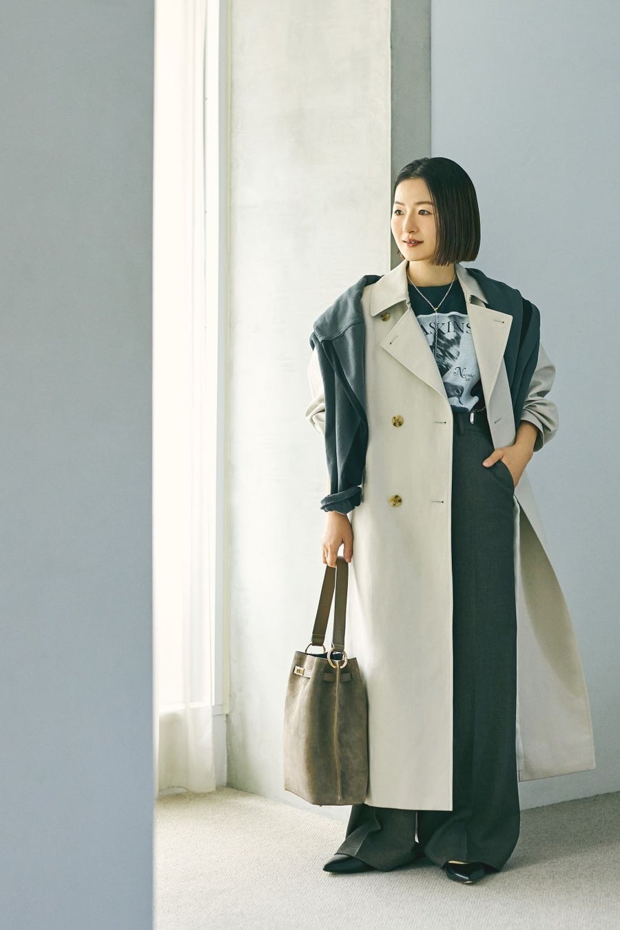 明るく爽やかな印象のライトカラーのロングトレンチは、ともするとコンサバティブになりすぎてしまうので、あえてプリントTシャツやカジュアルな印象のスウェットを肩掛けしたりして、崩して着ることを提案いたします。