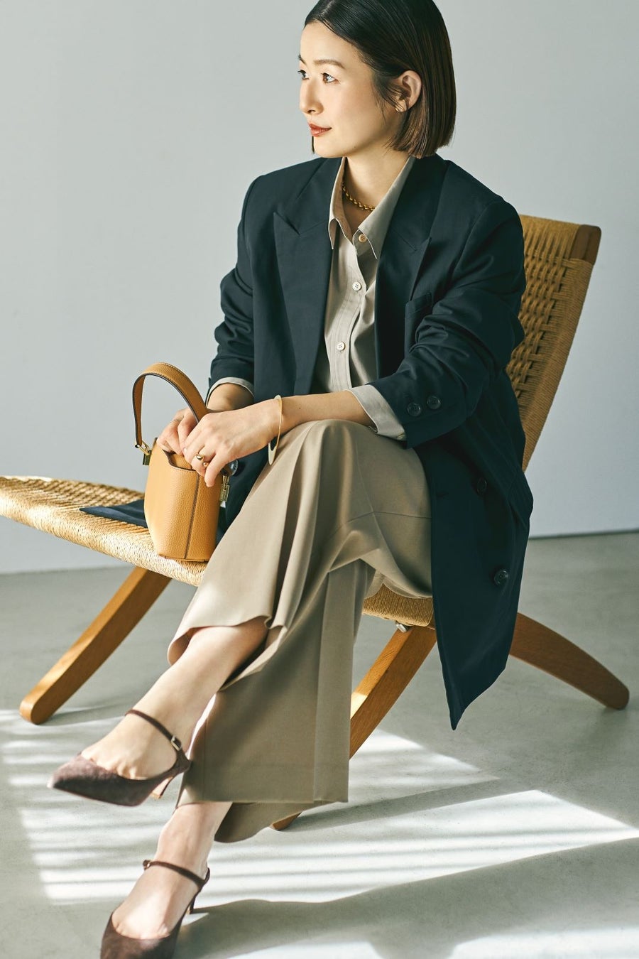 肩が少し大きめに作られていたり、ややボクシーなシルエットのアップデートされた黒ジャケットには、中をベージュワントーンで繋いで、ジャケットのシルエット(大きさ)だったり存在を強調してあげるのもオシャレかなと。春の黒ジャケットはやや強め&重めな印象になるので、ニュアンスカラーや白の混じったミルキーカラーを合わせるのがおすすめです。