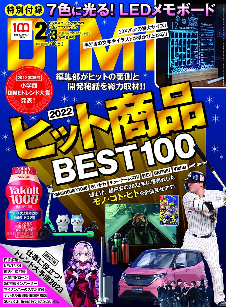 早いもので今年も残りわずか。ビジネストレンドマガジン「DIME」の年末恒例企画「DIMEトレンド大賞 2022」がついに決定した。その年にヒットしたモノ、コト、サービス、そして話題を集めた人物やキャラクターを表彰するこの賞も、今年は35回目。トレンドをキャッチアップし続けてきた「DIME」が選んだ2022年を代表するヒット商品は果たして!?