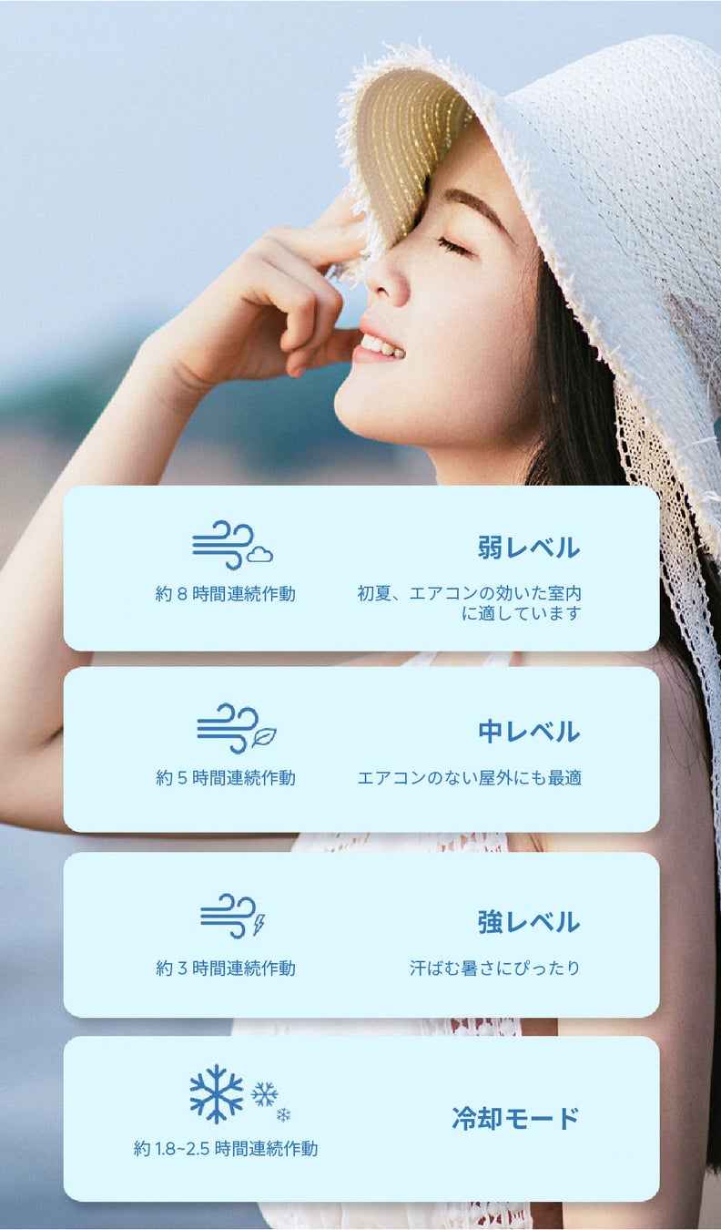 強力な冷却能力に加え、3段階の風速調整が可能です。1.8時間~8時間の連続使用が可能で、暑い一日を快適に過ごせます。