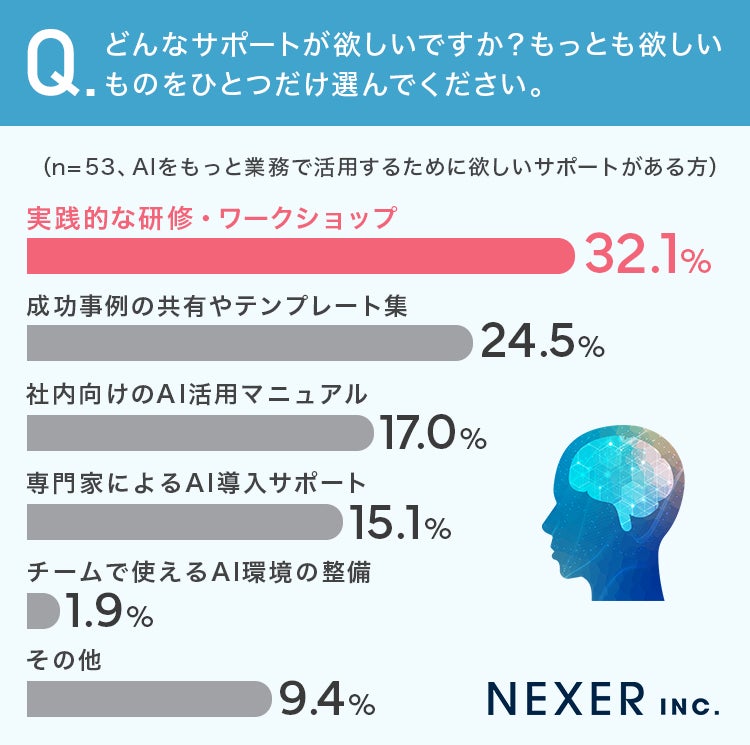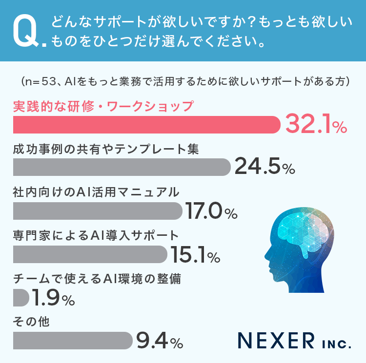 AIを業務でより活用するために欲しいサポートとしては、「実践的な研修・ワークショップ」が最も多く挙げられており、実際に使いながら学ぶ機会へのニーズが高まっています。