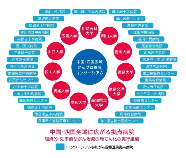 中国・四国広域がんプロ養成コンソーシアムは、中国・四国地域に位置する11大学がコンソーシアムを形成し、各大学院に多職種のがん専門医療人養成のためのコースワークを整備し、これに地域の35のがん診療連携拠点病院が連携することにより、広い地域にムラなくがん専門医療人を送り出すことを目的としています。