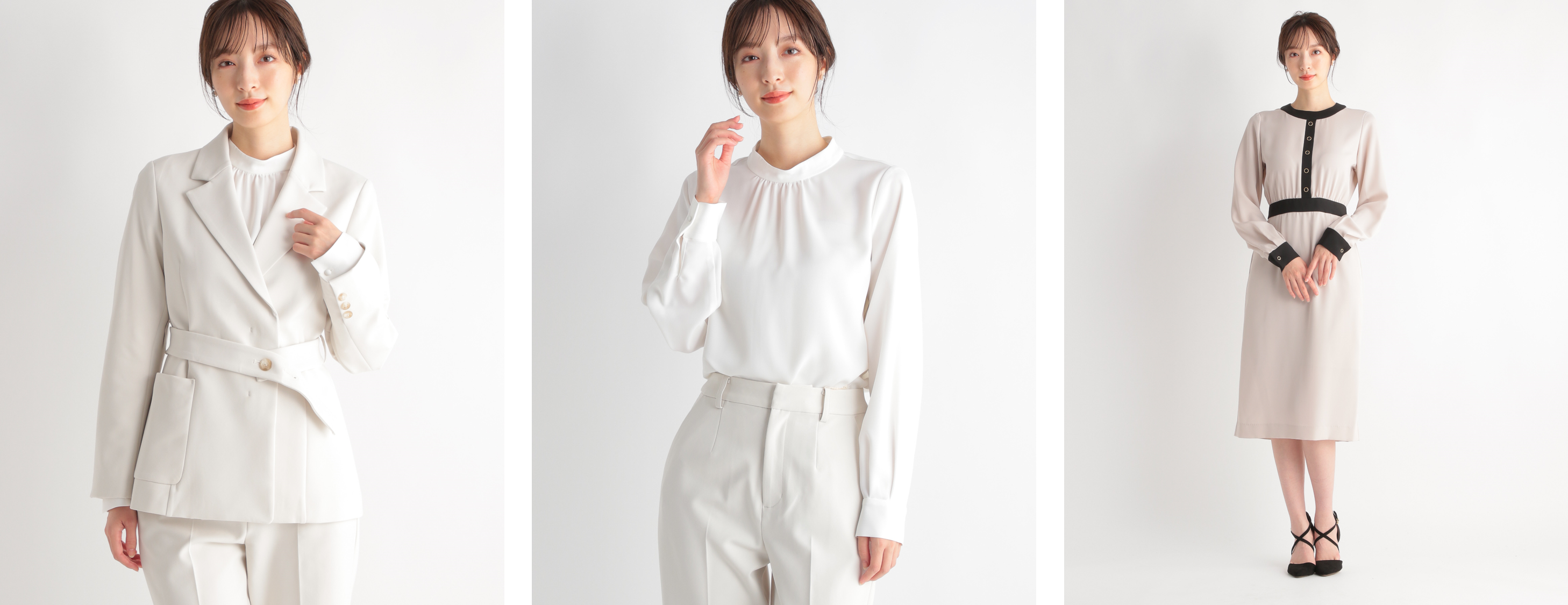 制服のデザインは、アンデミュウで人気のアイテムを軸に、実際に制服を着用するインフォメーションスタッフの声を取り入れ、素材にもこだわりながら、着心地と実用性を併せ持つエレガントなスタイルに仕上げました。