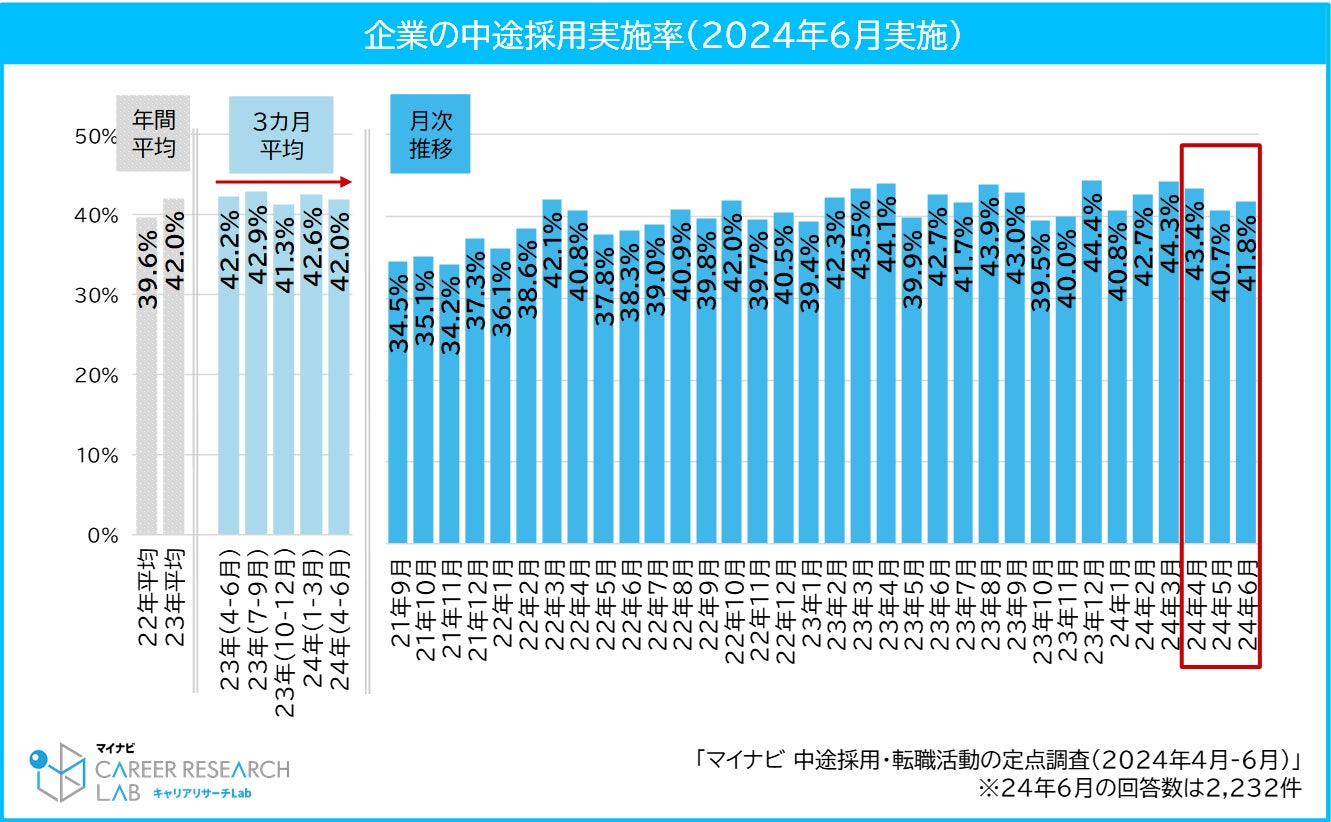 2024年6月の企業の中途採用実施率は41.8%だった。