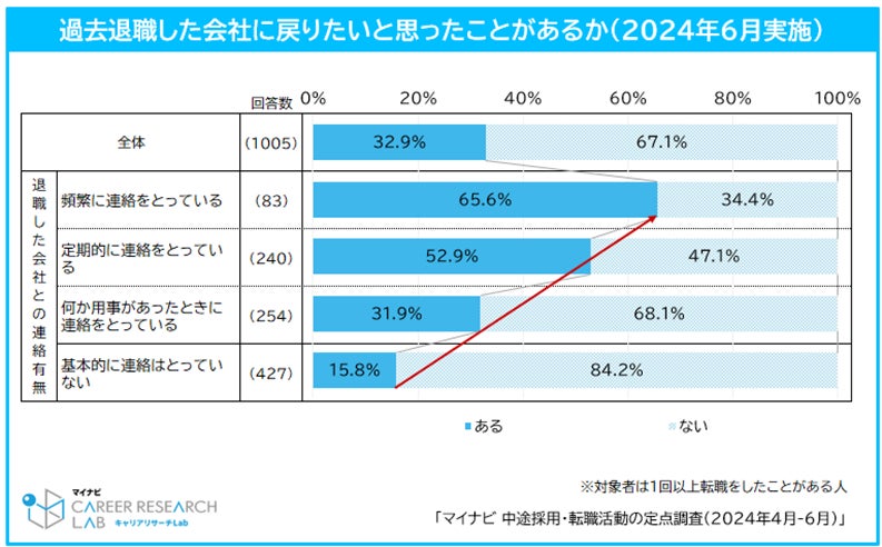 個人の「過去に退職した会社に戻りたいと思ったことがある」割合は約3割で、特に、退職後も頻繁に連絡を取っている人の場合、その割合は6割以上にのぼります。