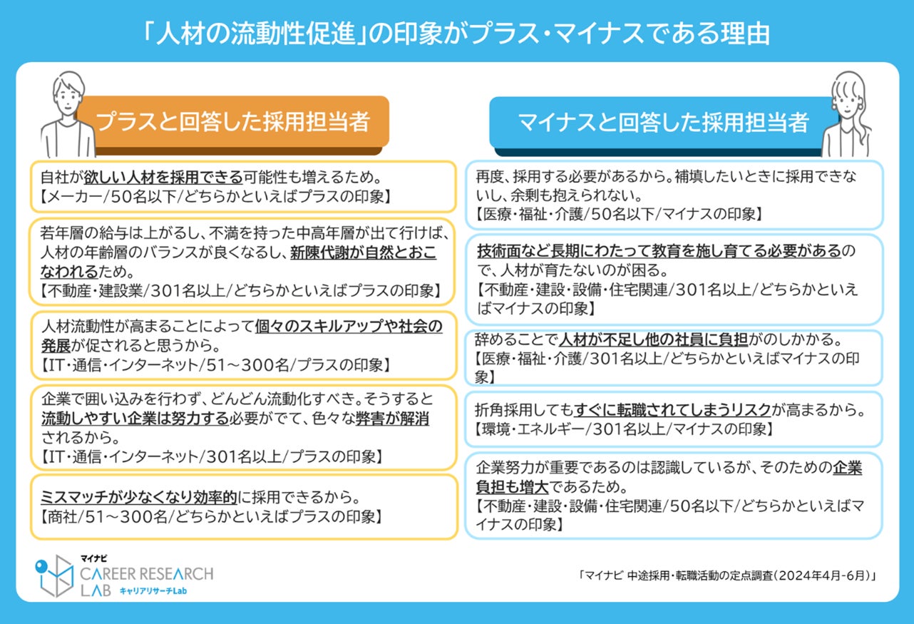 プラス・マイナスの印象である理由を自由回答で聞いたところ、プラスの理由は「欲しい人材を採用できる可能性が増える」「ミスマッチが少なくなり効率的」など人材獲得に対するメリットを挙げる回答が目立った。