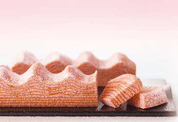 静岡県西伊豆産のさくら葉を使用したバウムクーヘン。フランボワーズパウダーを混ぜ合わせたホワイトチョコレートコーチングで包みました。