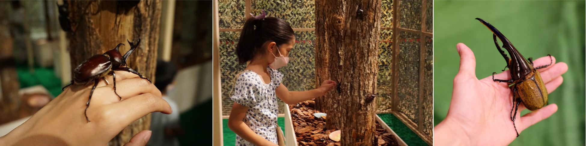生きたカブトムシやクワガタに存分にさわれるふれあいエリアや、ヘラクレスオオカブトに触れて写真が撮れるフォトスポットも!