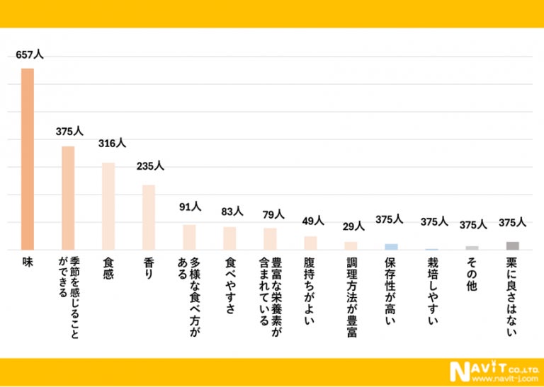 栗の良さについてのアンケートを複数回答でいただきました。1番多かった回答が「味」で657人でした。次に多かったのが「季節を感じることができる」で375人、さらにつづいて「食感」が316人と続く結果になりました。