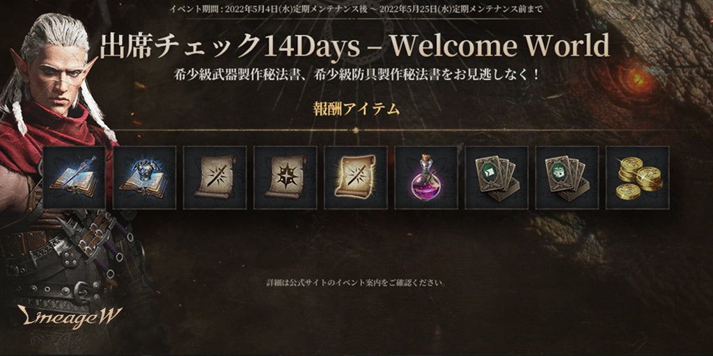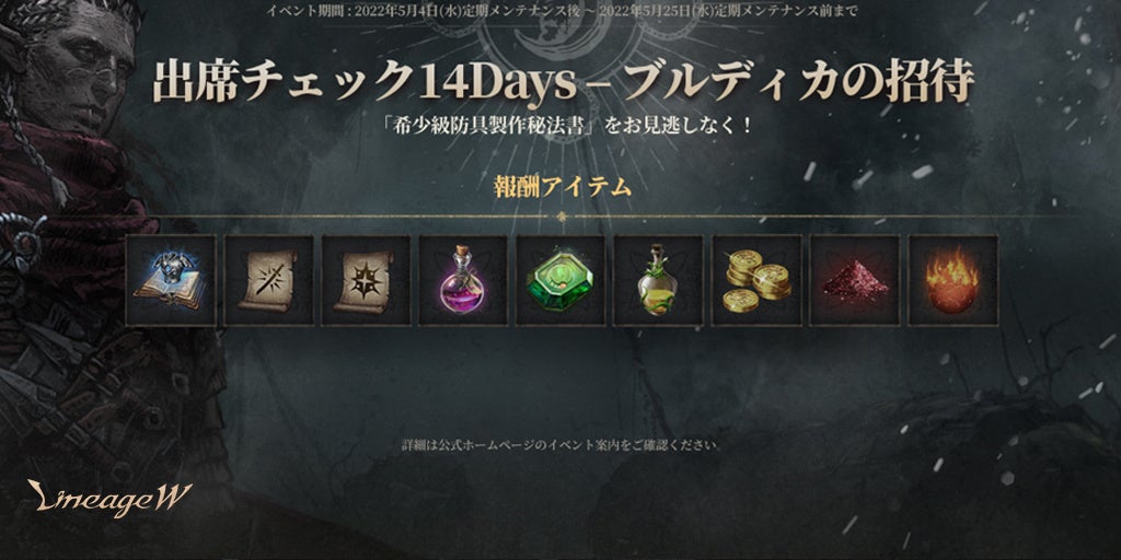 デイリー報酬として「勇気のポーション」が、また14日間の日別出席報酬アイテムとして「希少級武器製作秘法書(刻印)」や「希少級防具製作秘法書(刻印)」」などが獲得できます。