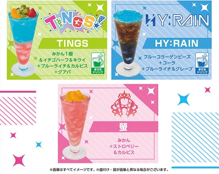 コラボドリンクメニューには、「シャインポスト」の各ユニットをイメージしたオリジナルコラボドリンク各750円(税込)をご用意しました。