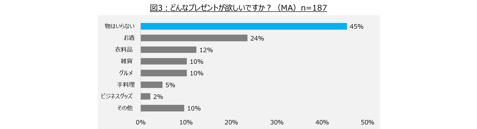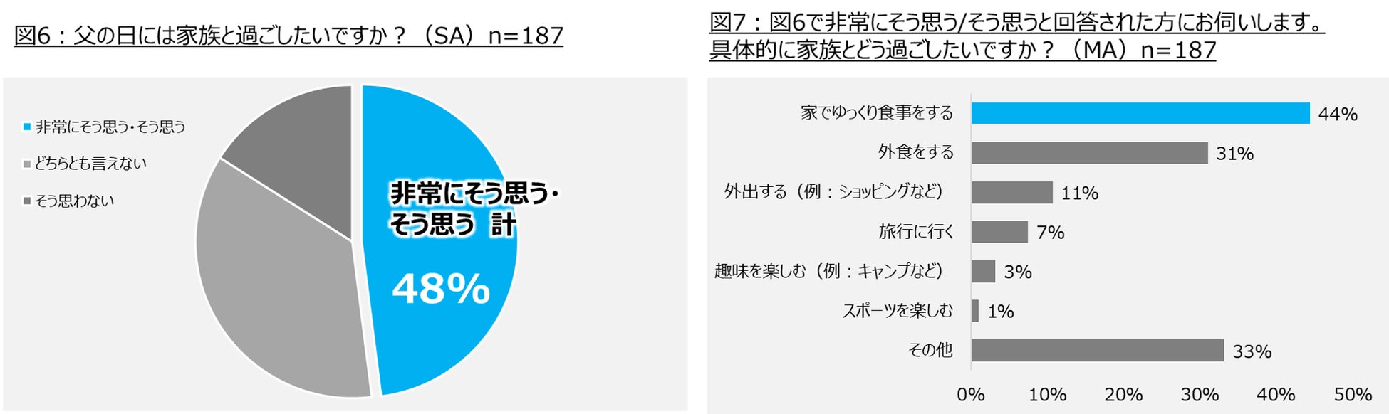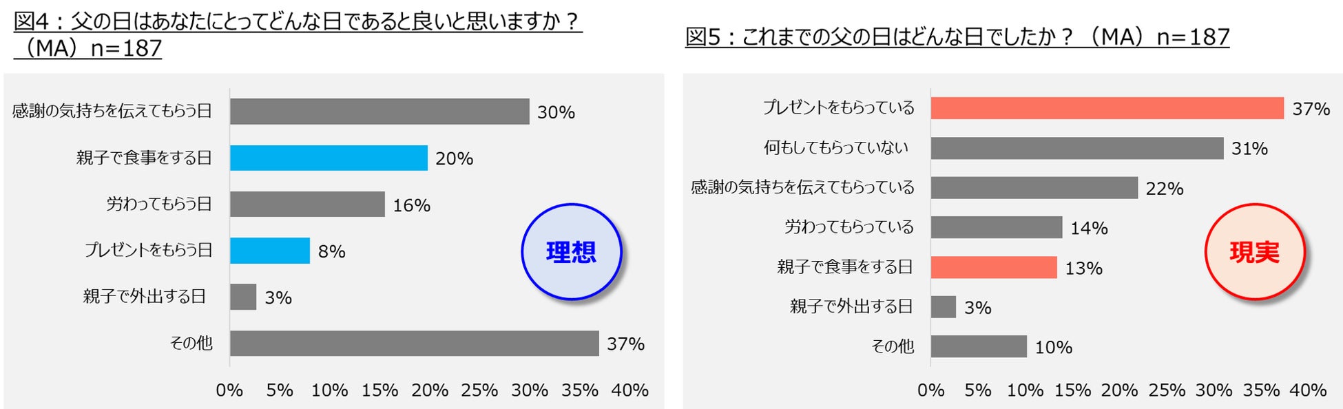 ・理想とする父の日は「感謝の気持ちを伝えてもらう日」や「親子で食事をする日」であることがわかりました。実際には「プレゼントをもらっている」回答が最も多い結果となり、プレゼントより「親子で食事がしたい」という理想と現実の差が明らかになりました。