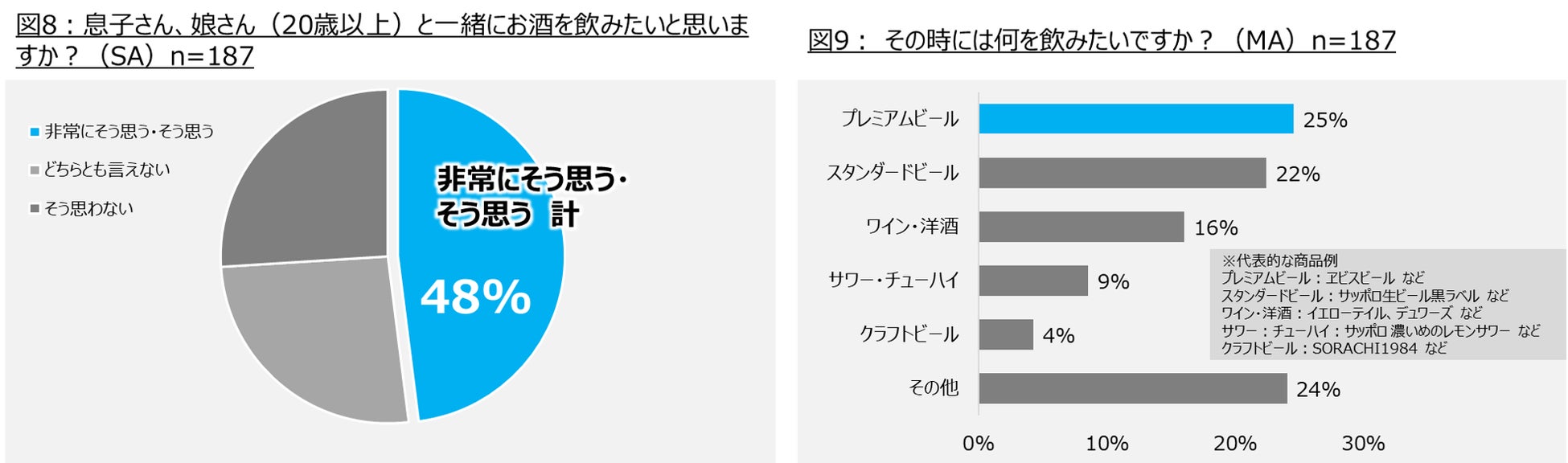 ・親子でお酒を飲みたいかという質問では「そう思う」以上が約半数の結果となり、その時に飲みたいお酒は「プレミアムビール」が最も多い回答となりました。