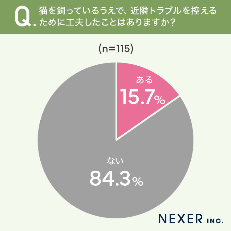 ■15.7%が猫を飼っているうえで、近隣トラブルを控えるために工夫したことが「ある」