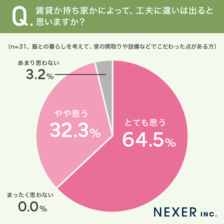 64.5%が「とても思う」、32.3%が「やや思う」と回答し、96.8%が賃貸か持ち家かで工夫に違いが出ると感じています。
