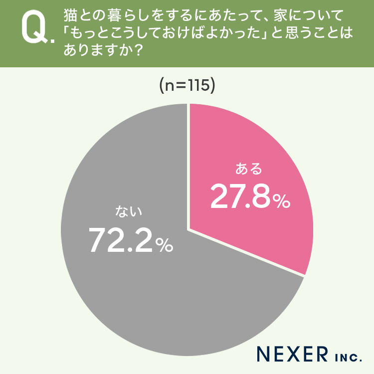 また、27.8%が「もっとこうすればよかった」と後悔しており、とくに広い遊び場や内装対策など、猫の行動欲求を満たす設備面へのニーズが明らかになりました。