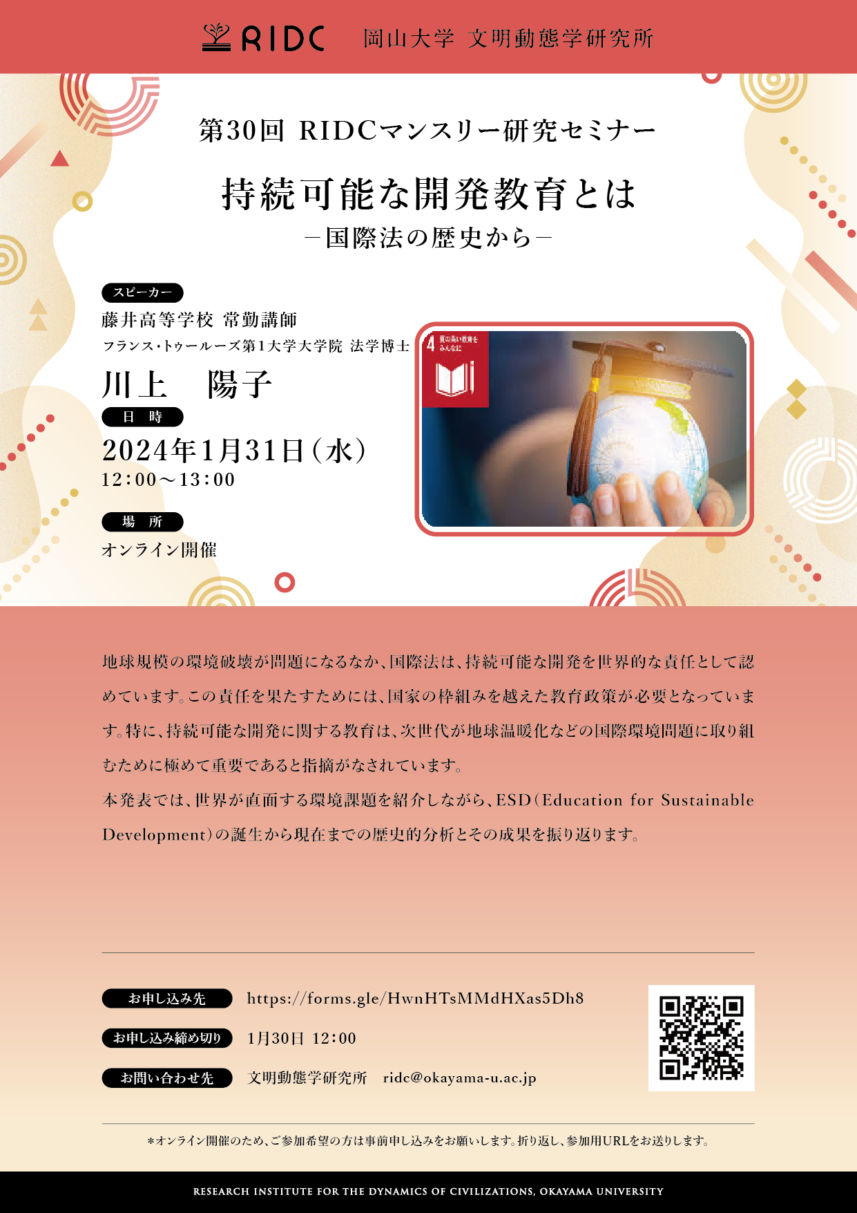 今回、2024年1月31日(水)にオンライン開催した第30回RIDCマンスリー研究セミナー「持続可能な開発教育とは-国際法の歴史から-」(スピーカー:藤井高等学校 常勤講師,フランス・トゥールーズ第1大学大学院 法学博士 川上陽子 氏)の録画配信を2024年2月1日に開始しました。ぜひ皆様にご視聴頂けますと幸いです。
