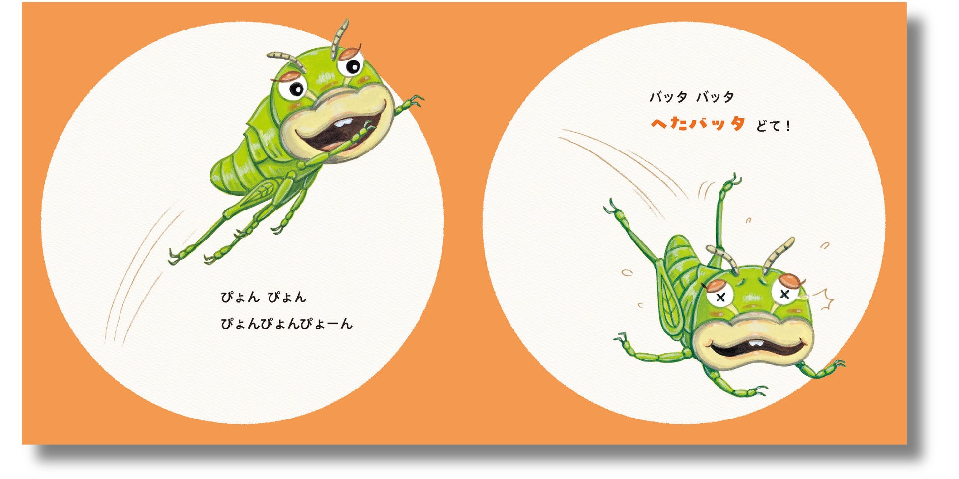 ほおバッタ、ふんバッタ、へたバッタ……。「バッタ」ダジャレが8連発! 虫への興味と言葉への興味がぐんぐん湧きます。