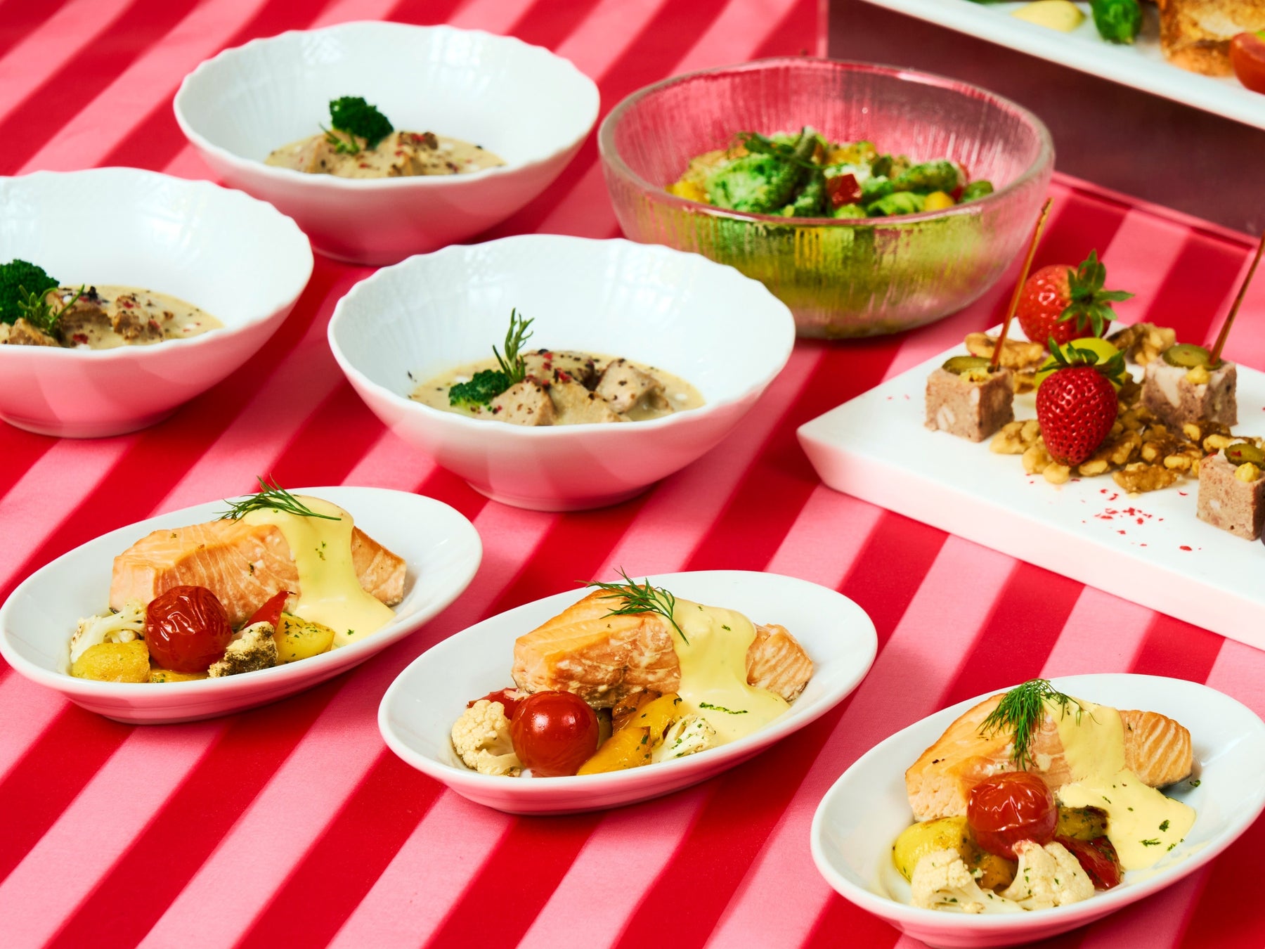 セイヴォリーには、魚介の旨味にバジルの爽やかな風味を効かせた「ミックスシーフードパスタサラダ バジルペースト」、酸味がアクセントのマスタードクリームにクローブがすっきりとした味わいを添える「ポークとマスタードクリームの煮込み オリーブ ブロッコリー」、脂がのったサーモンをオーブンで芳ばしく焼き上げ、柚子が香るオランデーズソースで味わう「サーモンのオーブンベイク 野菜のソテー 柚子風味オランデーズソース」など、甘いスイーツのお口直しに、コールドセイヴォリーとホットセイヴォリー各4種をご用意します。