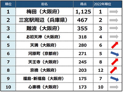一方関西では圧倒的首位に9年連続で「梅田」。2位以降もトップ10の顔ぶれは大きく変わらない結果となりました。その中で順位を上げた8位の「京橋」はアクセスの良さ以外に「庶民的」「コスパが良い」の声が多く、これは関東の「赤羽」も同様にみられ、飲食をレジャーとして楽しめる街にも人が戻ってきているようです。