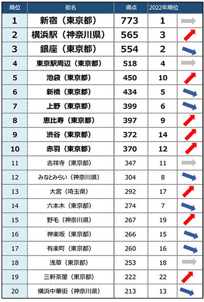関東の1位から3位までは昨年に続き「新宿」「横浜駅」「銀座」がランクイン。昨年から1つ順位を上げて2位になった「横浜駅」や大きく躍進した「池袋」「渋谷」については「アクセスが良い」「飲み屋が多い」という声以外に「会社の近くだから」が目立ち、コロナによる行動制限緩和の影響からかオフィスや飲食店が集まるターミナル駅に人が戻ってきたことがうかがえます。