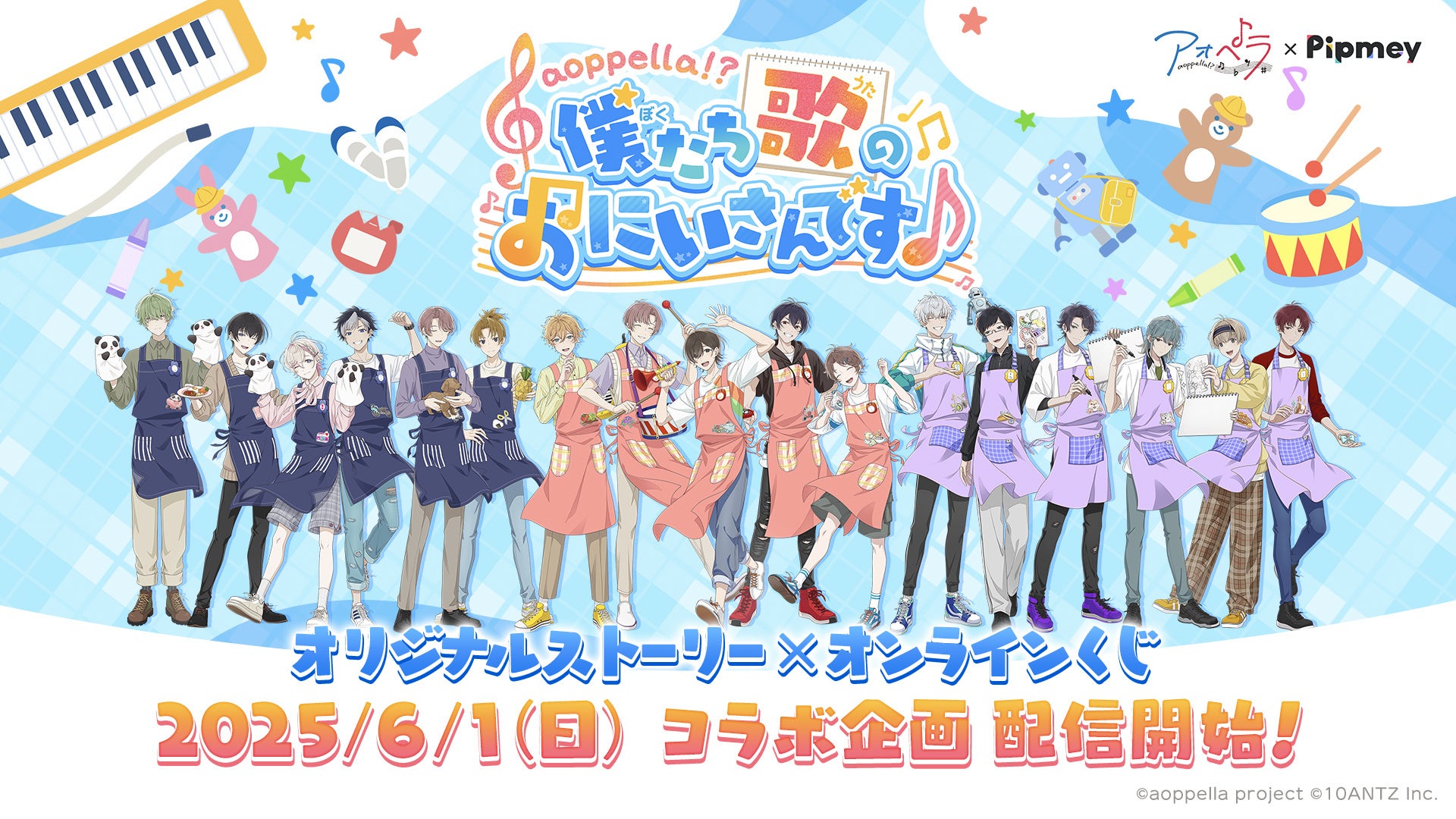 本コラボでは、新ビジュアルを使用した商品が当たるオンラインくじの販売のほか、アオペラメンバー17人が「歌のおにいさん」として奮闘する様子が楽しめるオリジナルストーリーを「Pipmey」プラットフォーム内にて順次公開していきます。
